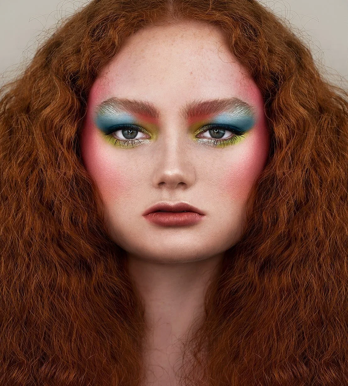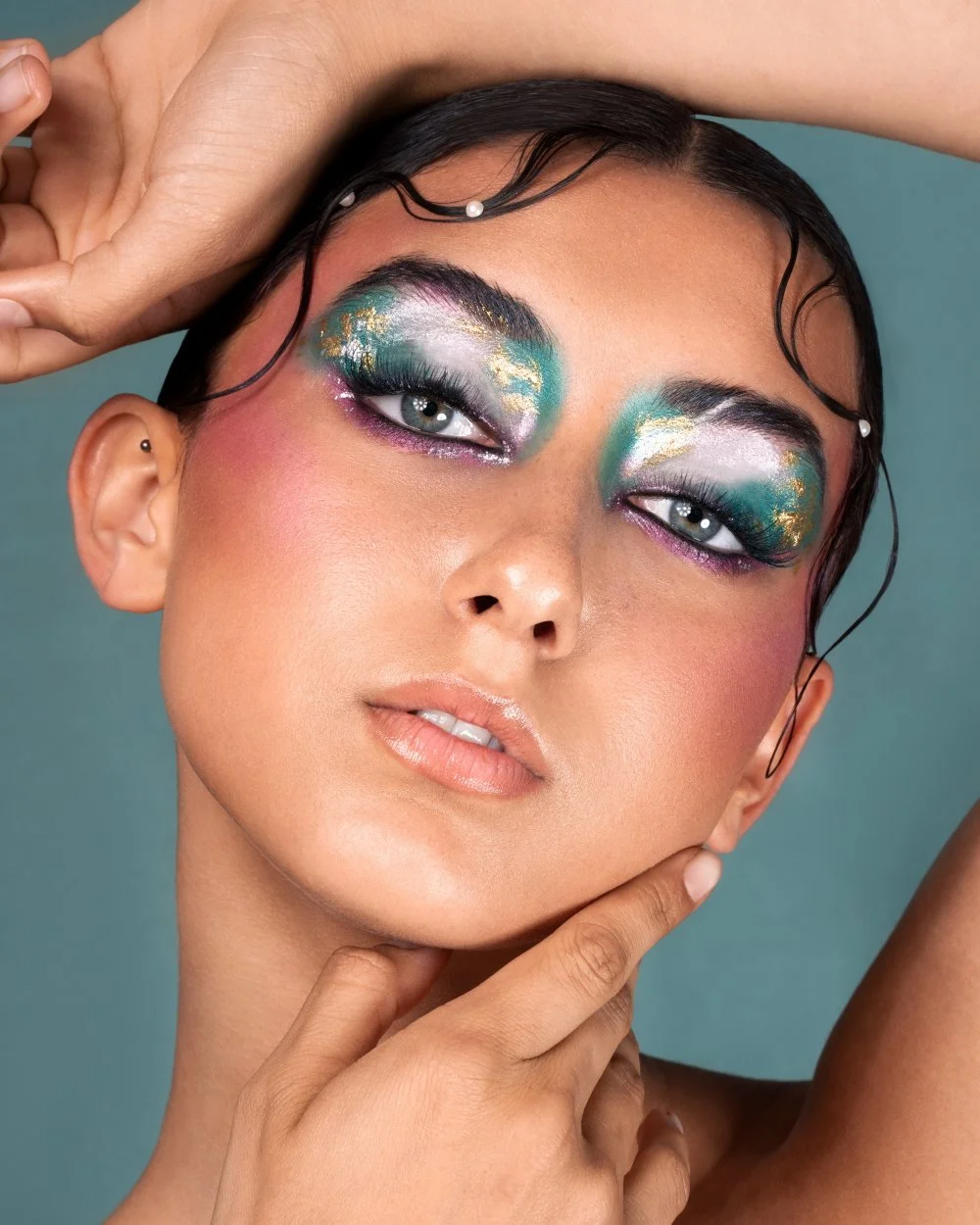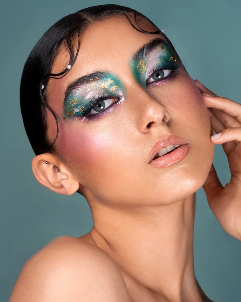 Makeup on a female model with red brown hair. Makeup is fresh dewy skin, red glossy lips, colourful gemstones on her eyes